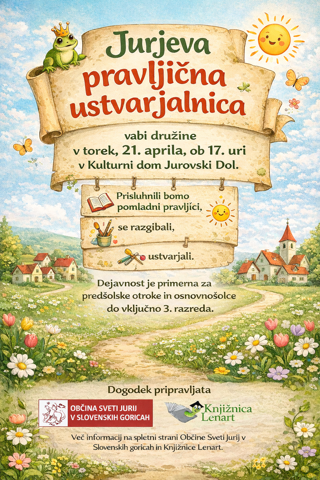 Jurjeva pravljična ustvarjalnica vabi v torek, 21. aprila, ob 17. uri v Kulturni dom Jurovski Dol. Dogodek poteka v okviru obeleževanja občinskega praznika.