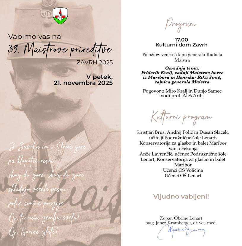 V petek, 21. novembra, ob 17. uri na Zavrh vabijo Maistrove prireditve 2025.