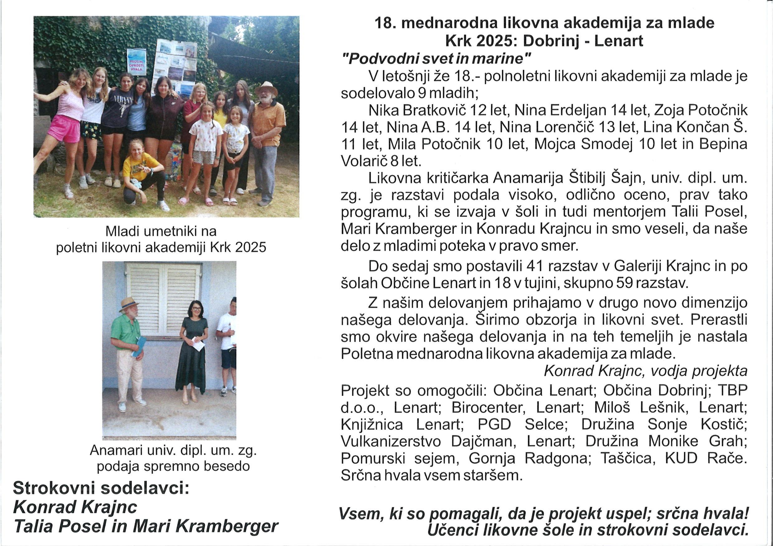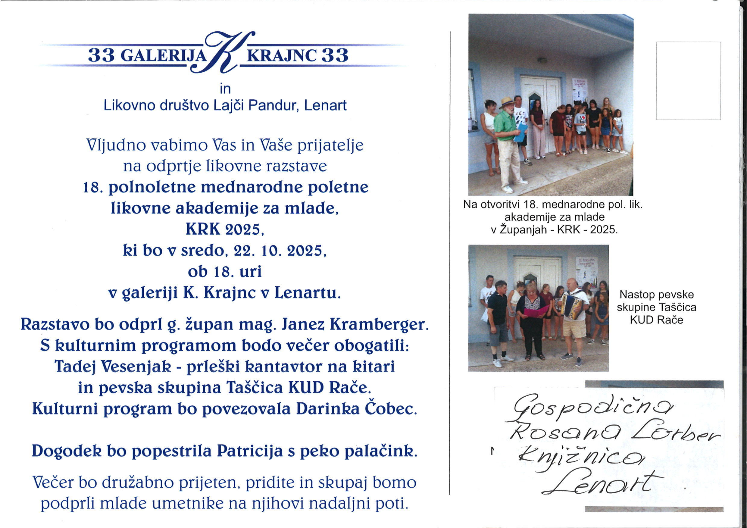 V sredo, 22. oktobra, ob 18. uri vabljeni v Galerijo K. Krajnc v Lenartu, kjer bo potekalo odprtje razstave likovnih del 18. mednarodne poletne likovne akademije za mlade KRK 2025.