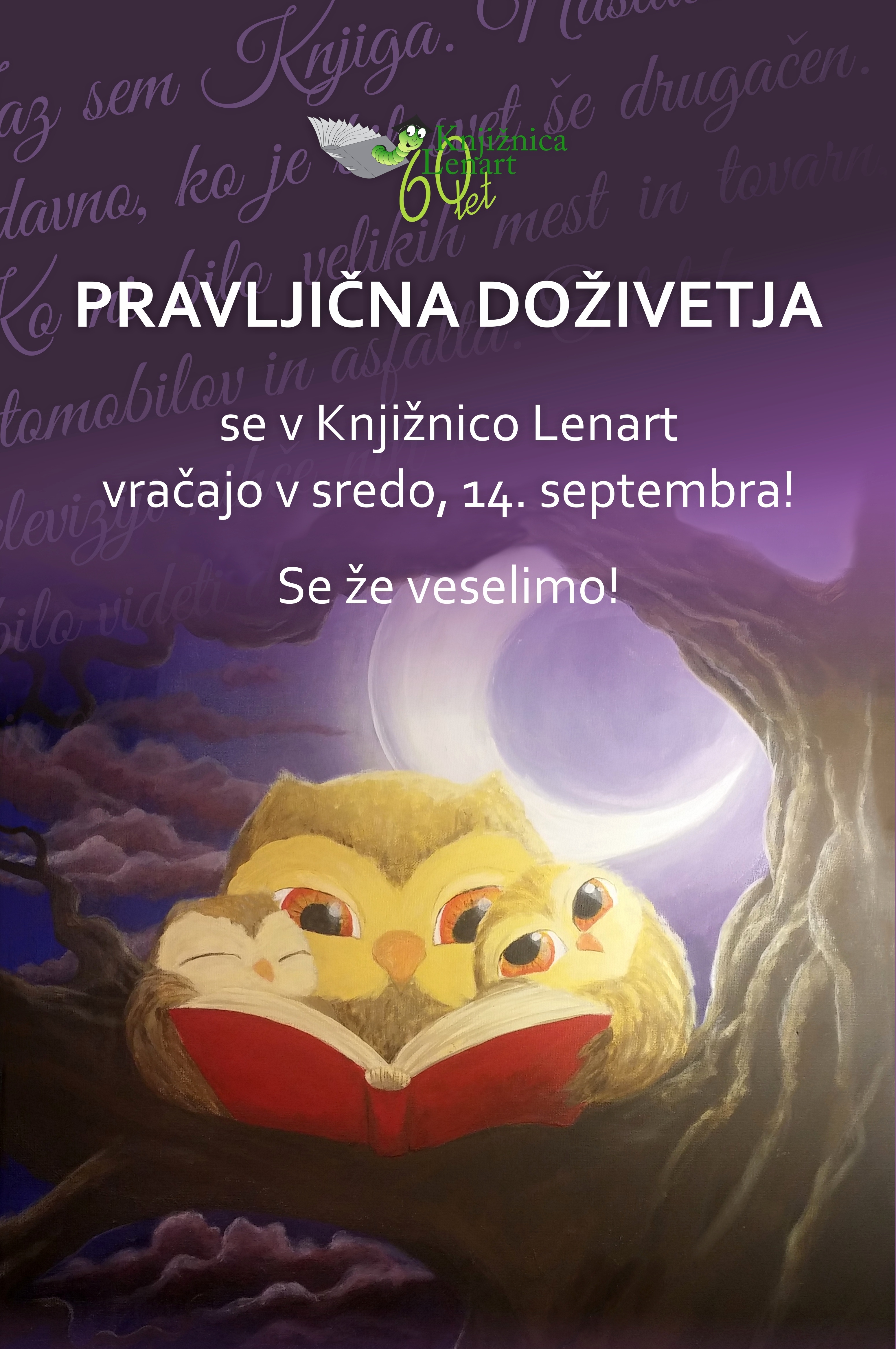 V juliju in avgustu so se pravljične srede v obliki delitev video pravljic preselile na splet, v avgustu pa smo se eno soboto mudili v lenarškem parku v sklopu LENart-a v naši Knjižnici pod kostanji. Eno soboto pa nam jo je zagodlo vreme, a nič za to, pravljična srečanja se že v septembru ponovno vračajo v našo pravljično sobano. Prvo pravljično doživetje bomo za naše mlade bralce pripravili že v sredo, 14. septembra, ob 16. uri!