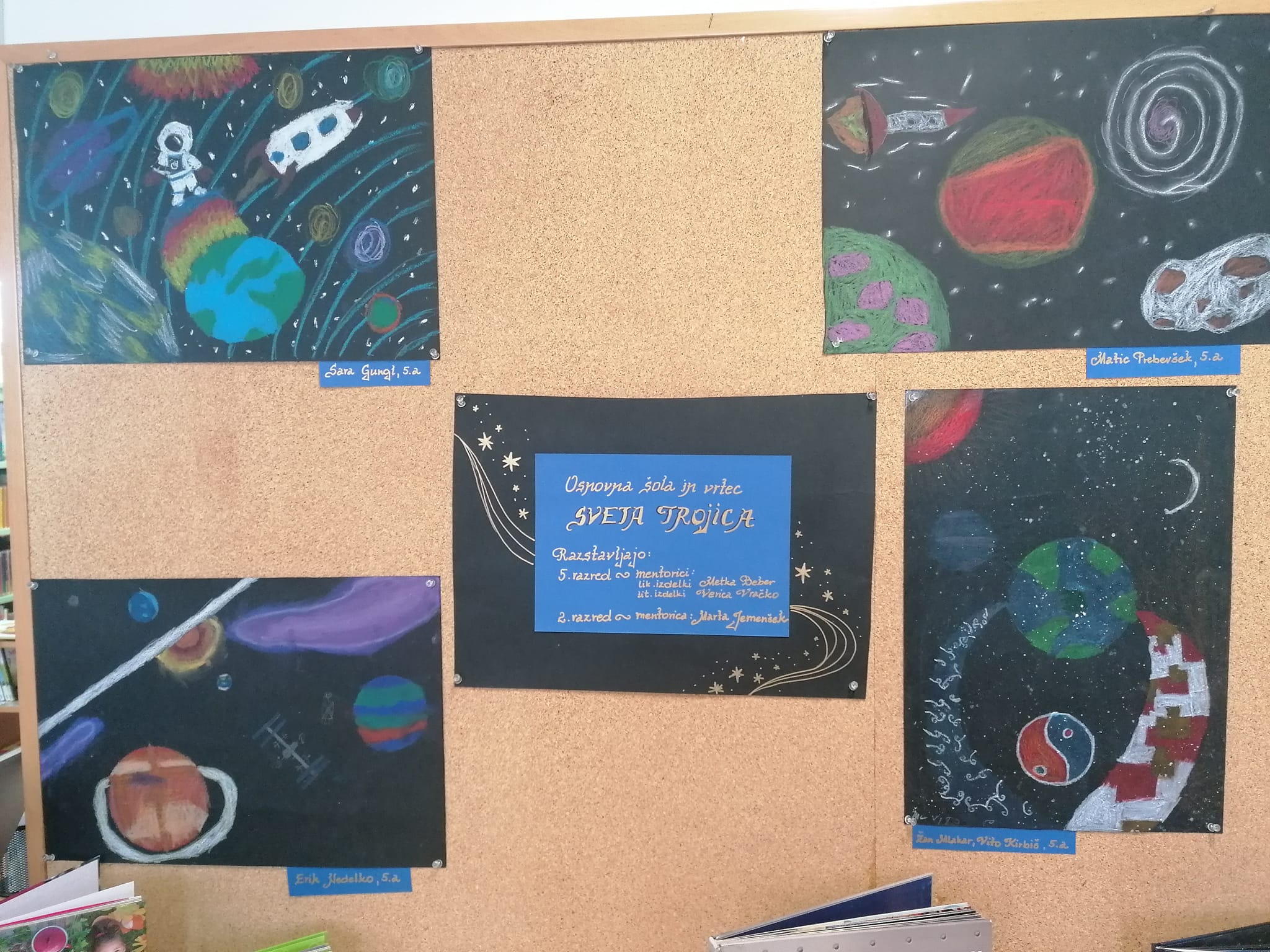 Na naše likovno povabilo Jaz rišem vesolje! so se odzvali tudi učenci 5. razreda OŠ Sv. Trojica, ki bodo likovne izdelke na temo vesolja v naših prostorih razstavljali med 15. marcem in 15. aprilom. Njihova mentorica je Metka Beber. Pridružili so se jim še učenci 2. razreda, ki so prav tako likovno ustvarjali na temo vesolja. Njihova mentorica je Marta Jemenšek.