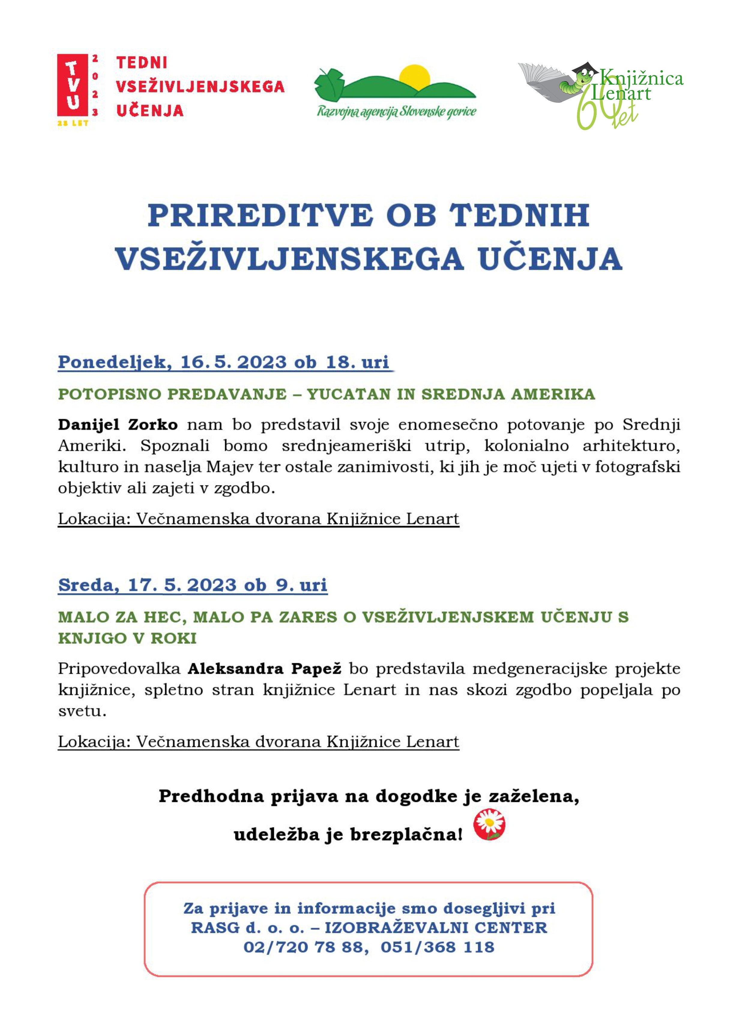 Oba dogodka potekata v prostorih Knjižnice Lenart in ju pripravlja Izobraževalni center, ki deluje v okviru RASG.