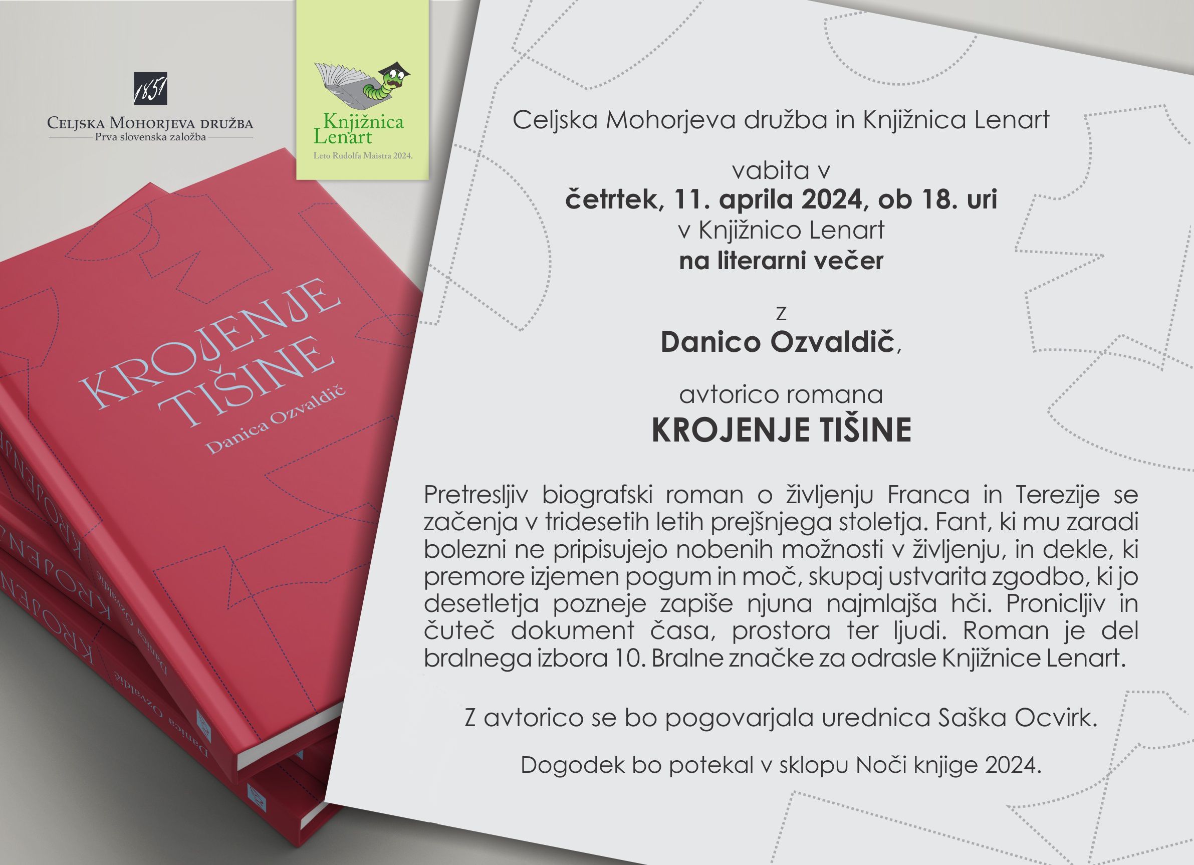 Pridite v Knjižnico Lenart v četrtek, 11. aprila, ko bomo ob 18. uri v sodelovanju s Celjsko Mohorjevo družbo predstavili roman Krojenje tišine.