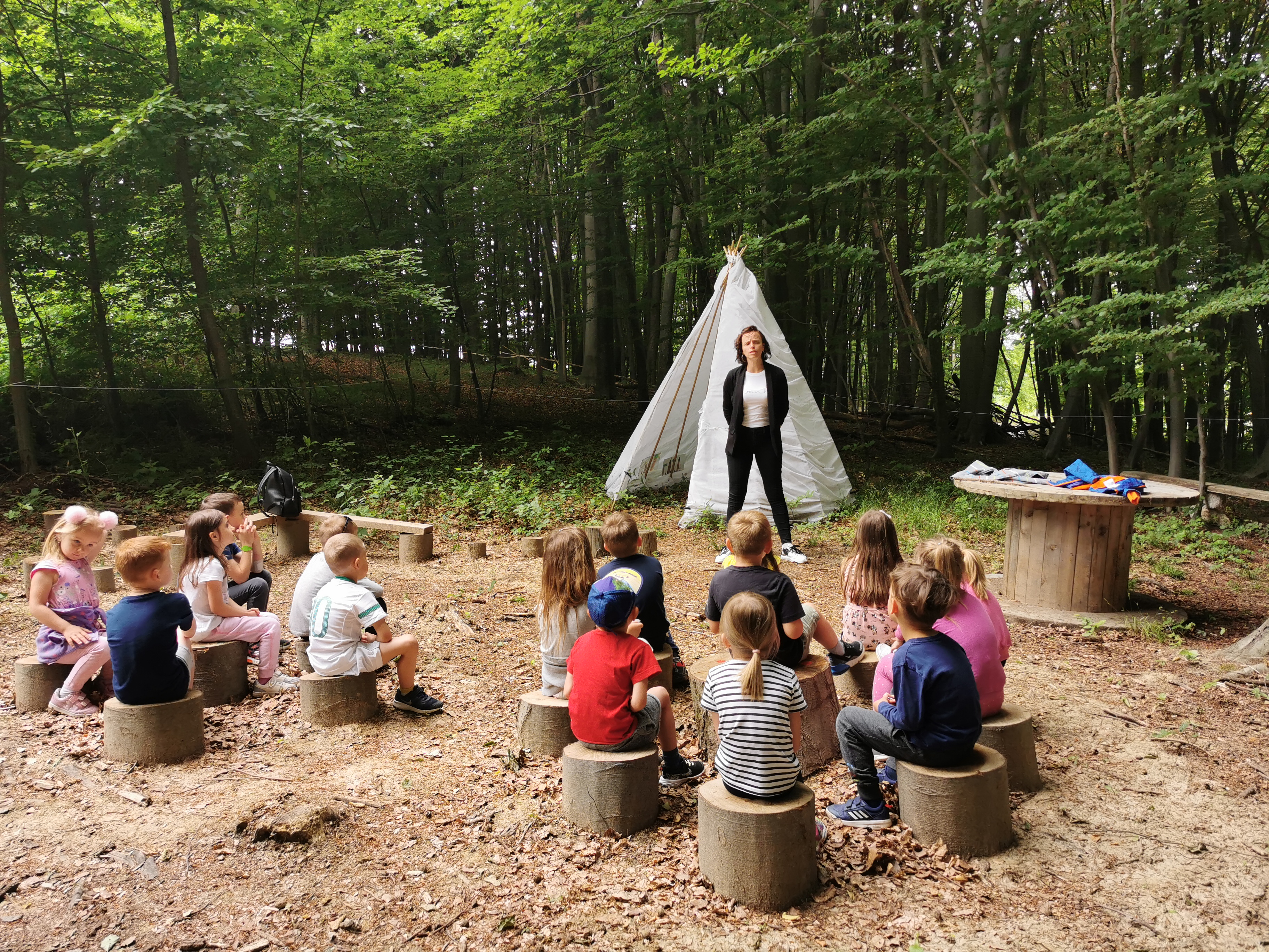 Pravljična ura v gozdni igralnici v Voličini