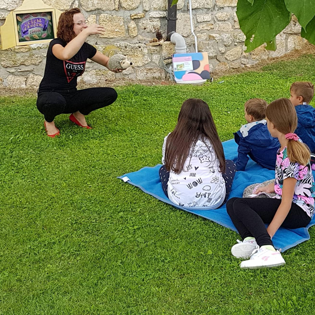 S pomočjo majhnega lesenega odra, imenovanega tudi butaj, ki smo ga pred leti izdelali v Knjižnici Lenart, je naša pripovedovalka v Sveti Trojici predstavila ježka in njegovo čudežno zgodbo. V družbi likovnikov, Barbare Borlovan in Romea Štrakla, ki ustvarjata pod imenom Art Roba, pa so otroci po pripovedi ježka še upodobili z raznimi risarskimi tehnikami.