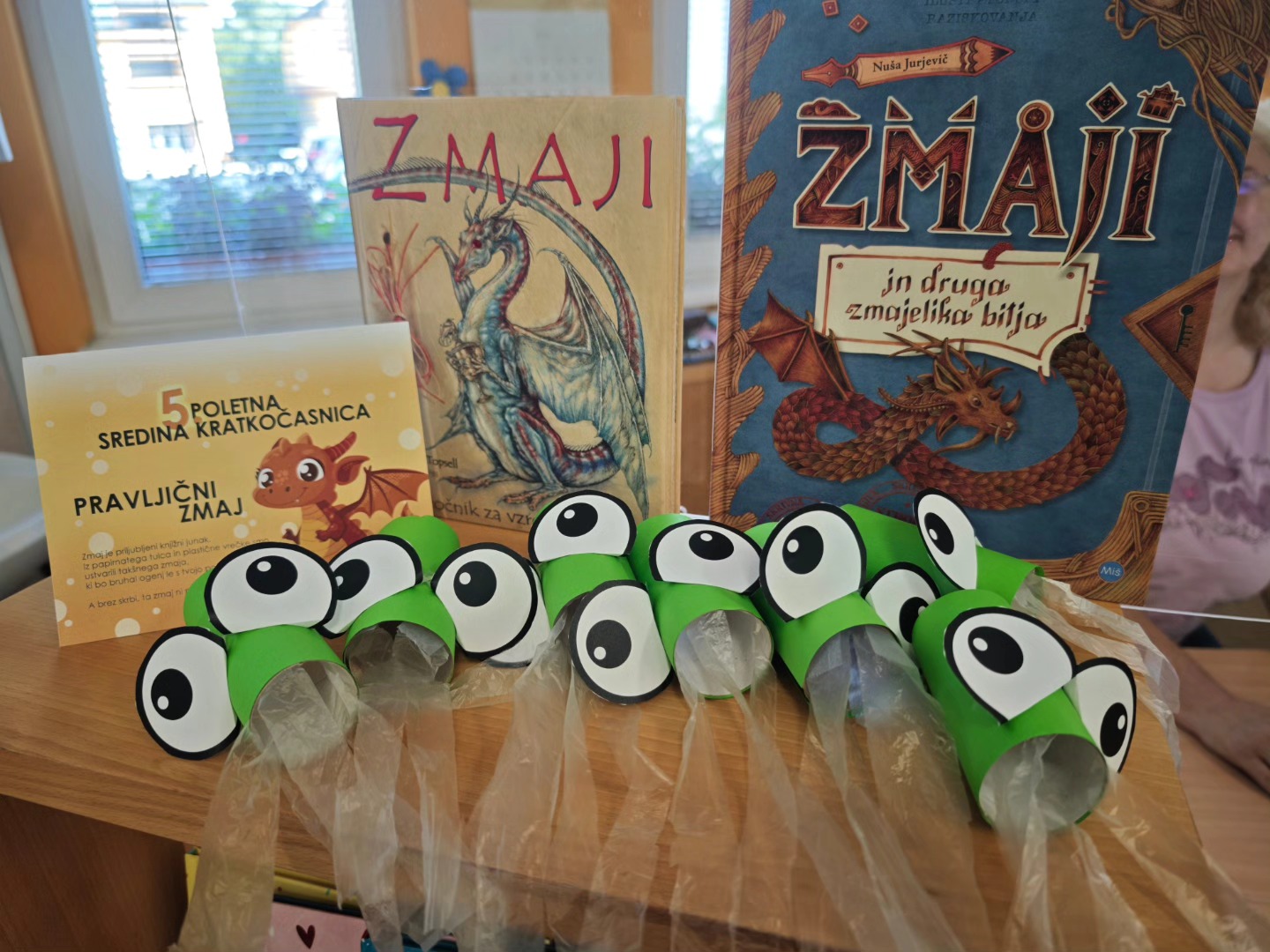 5. poletna sredina kratkočasnica med nas prinaša zmaja iz papirnatega tulca in plastične vrečke, ki smo ga povezali z izpostavljenimi knjigami, saj smo zmaji vedno veljali za priljubljene knjižne junake.