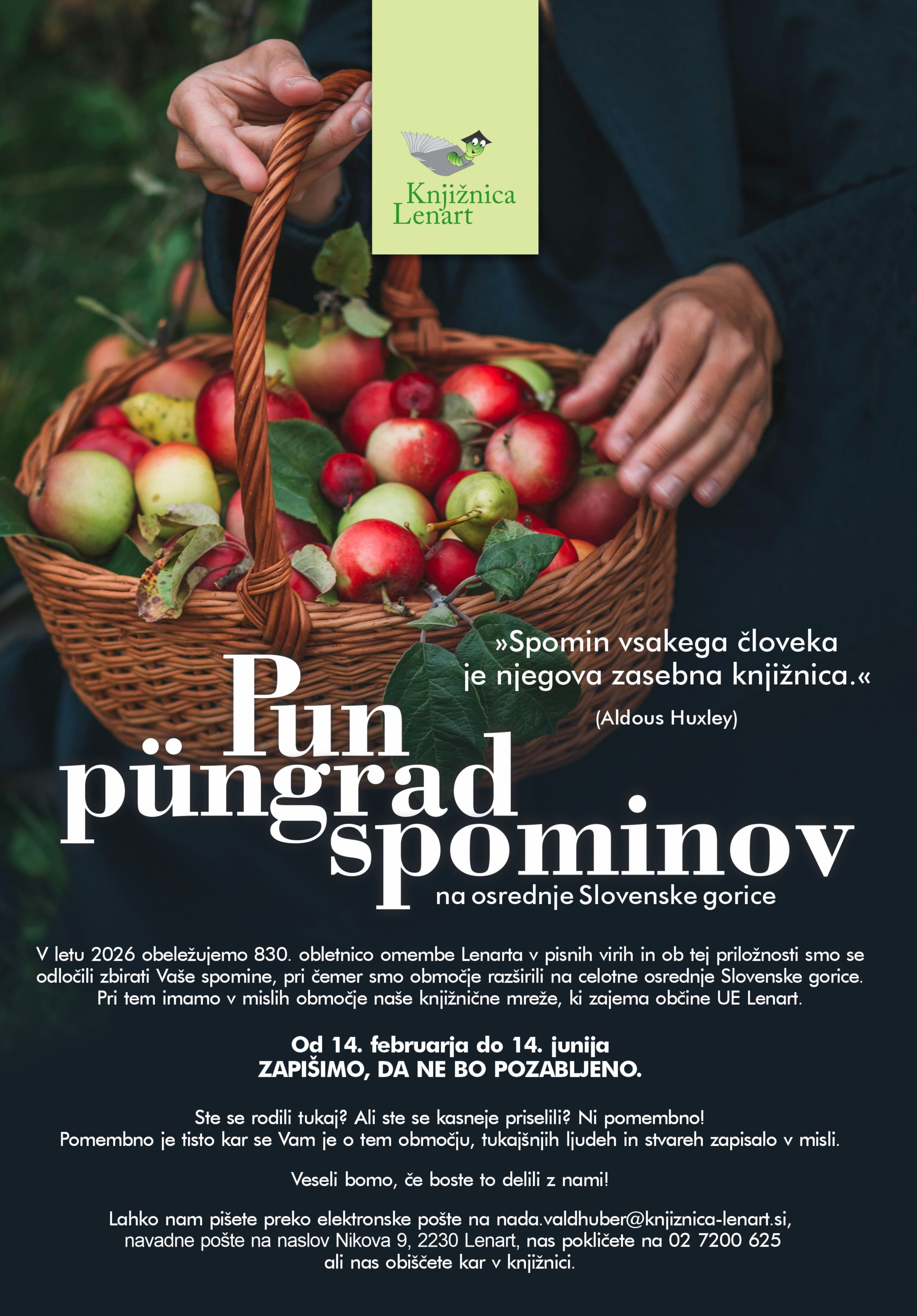 Od 14. februarja do 14. junija 2026 bomo v Knjižnici Lenart zbirali Vaše spomine na preteklost v osrednjih Slovenskih goricah. Pri tem imamo v mislih našo knjižnično mrežo, ki obsega kraje UE Lenart.